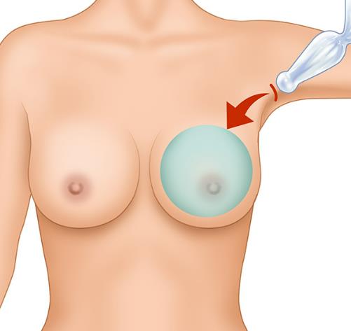 ケラーファンネルを使用し挿入します。使用することで、シリコンバッグの挿入がスムーズになり、切開部分へのダメージが最小限になるため、傷跡がより目立ちにくくなります。