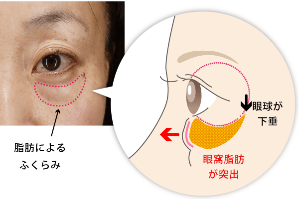 年齢を重ねると、眼球を支える力が弱くなり、徐々に眼球は下垂してきます。それによって目の下にある眼窩脂肪が押し出され、手前に飛び出してきます。突出した脂肪による凹凸によって陰影ができ、目の下のクマが生じます。