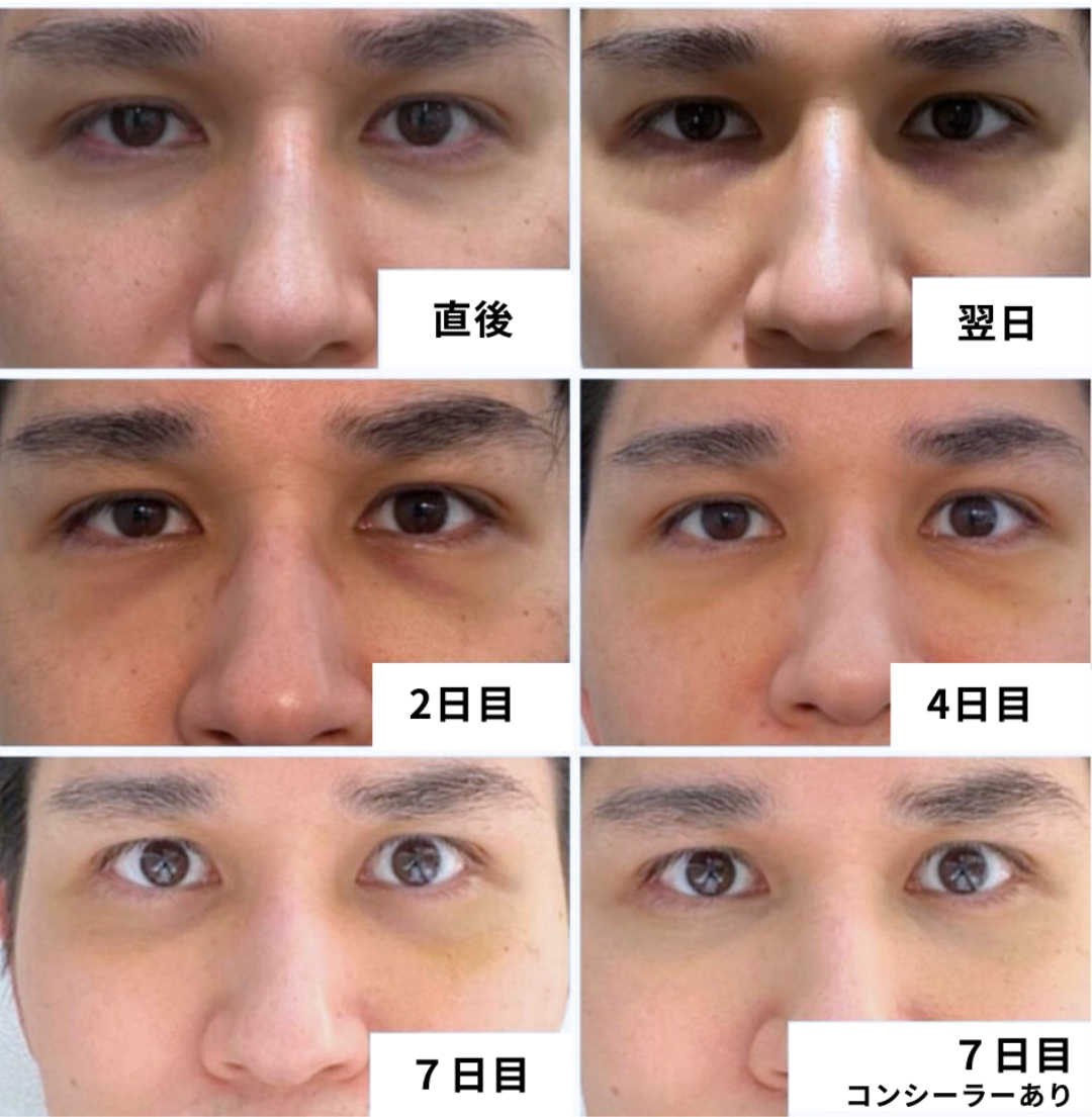 • 内出血:個人差はありますが、目の周りに生じることがあります。内出血が出た場合には、通常1週間から2週間程度で目立たなくなります。
