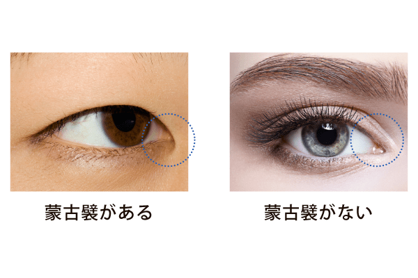 東洋人の目元は欧米人と比べて、目頭部分が白目を覆うように皮膚があることが多いです。この目頭部分の皮膚を蒙古襞(もうこひだ)と言います。特に、一重や奥二重の方に多く、蒙古襞があるために目が小さく見えたり、目と目の間が離れて見えてしまったりします。
