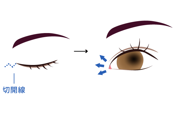 目頭切開は、目頭の皮膚を数ミリ切開することで、目を大きく見せる施術です。離れ目の解消や、平行型のくっきりとした二重になりたい方におすすめの施術です。