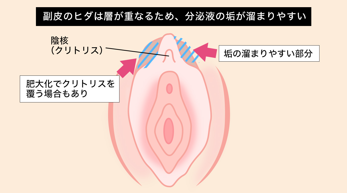 副皮はそもそもない方もいらっしゃいますが、あると、クリトリス側の小陰唇のヒダの層と重なって、汚れや垢が溜まりやすくなります。