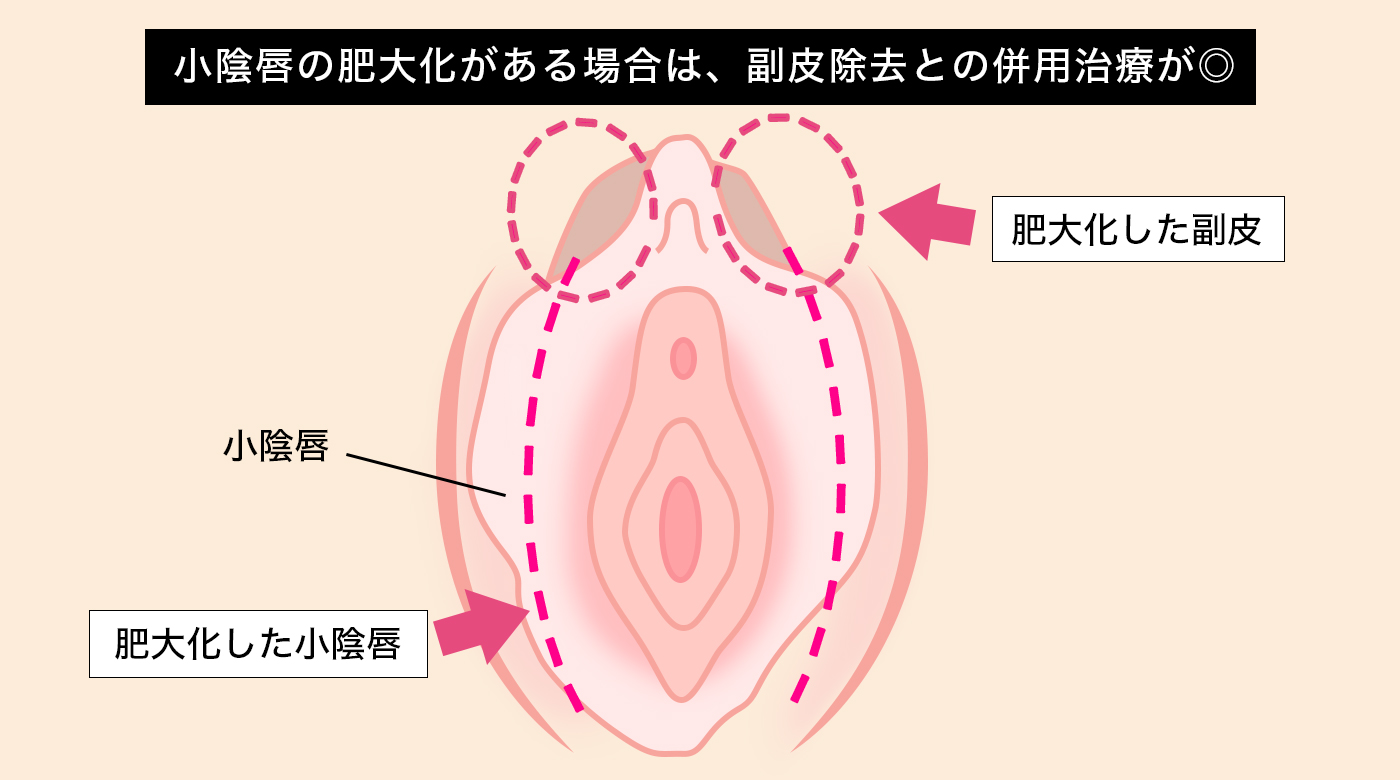 副皮が伸びて大きくなっている場合は、小陰唇も肥大化しているケースが見られますので、一緒に切除してスッキリと見た目を整えられる方が多いようです。