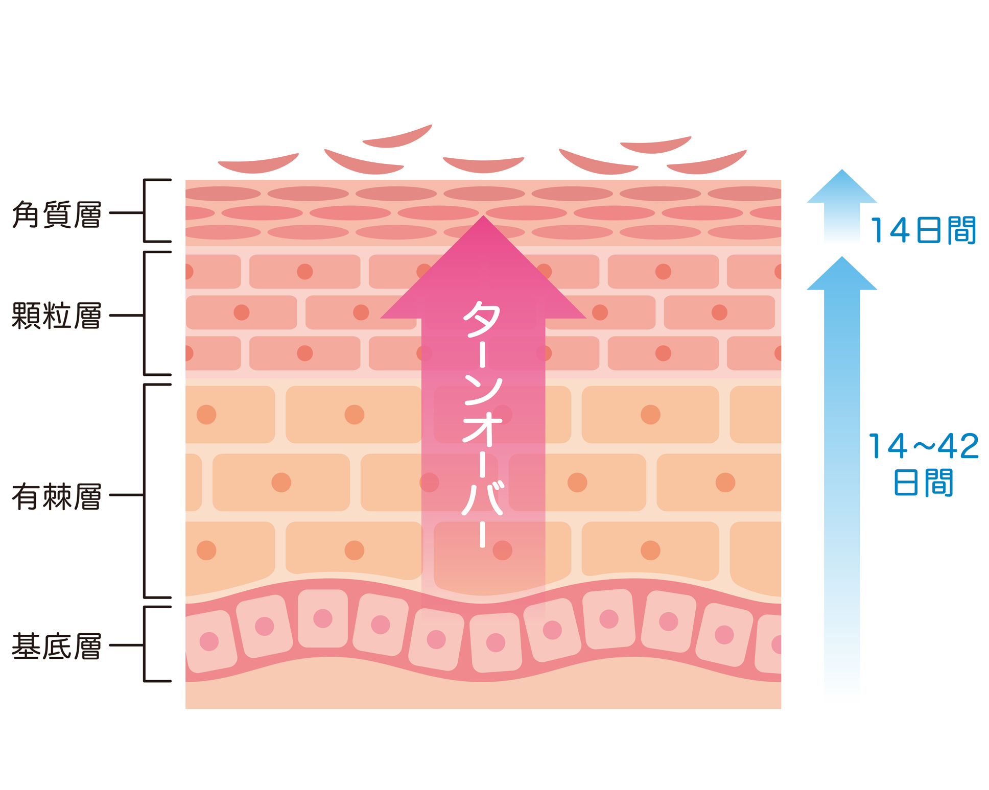 本来、健康な肌は約28日周期で新しい皮膚に置き換わります(ターンオーバー)が、様々なダメージを受けたり、加齢とともにこの周期が乱れ、肌表面に残った古い角質が溜まり新陳代謝が悪くなることで、くすみ・毛穴の開きや黒ずみ・ニキビ・小じわなどの様々な肌トラブルの原因となってしまいます。