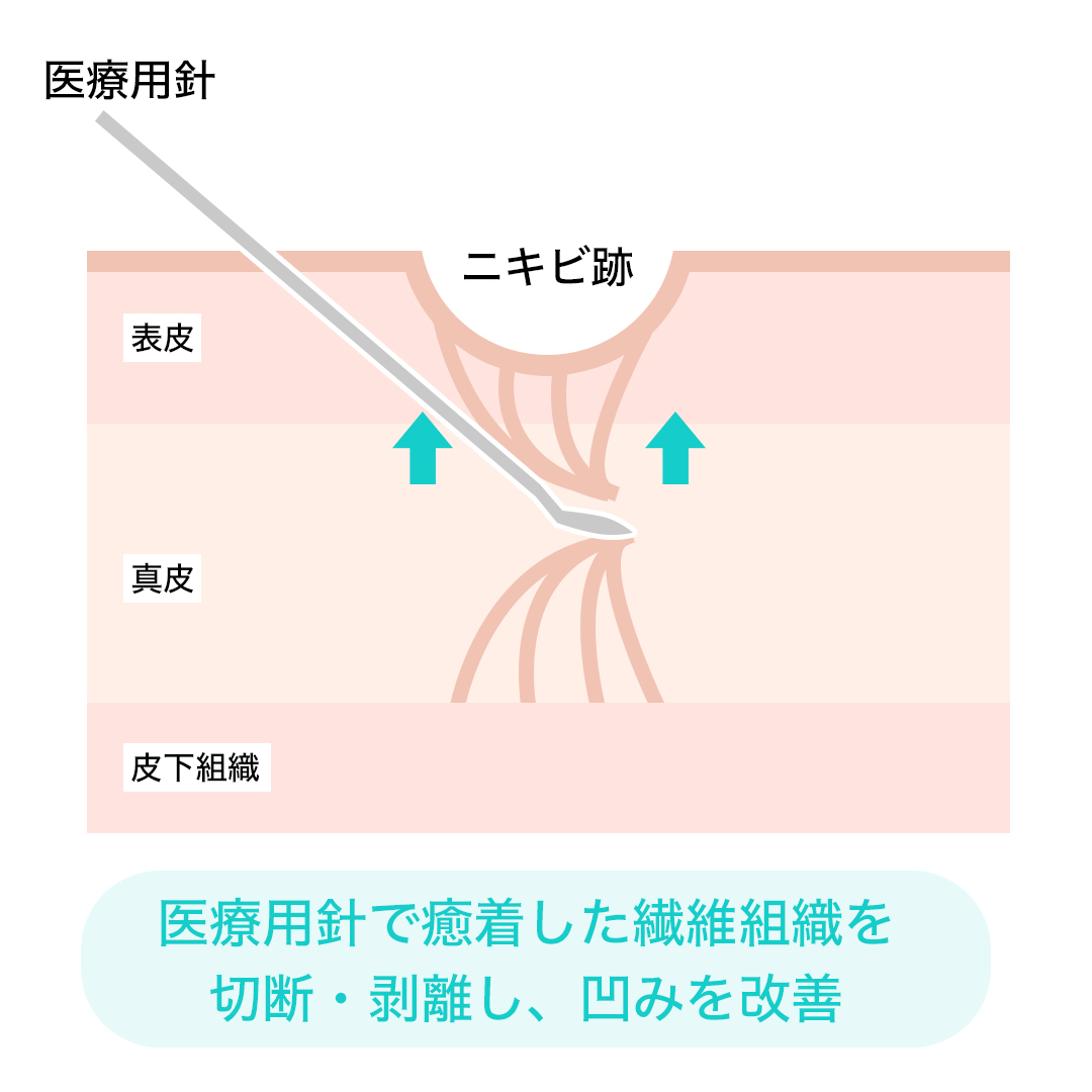サブシジョンは、医療用の針を皮膚の表面から刺し、針で皮膚深部の固い線維を直接ほぐすことにより肌のくぼみを改善します。