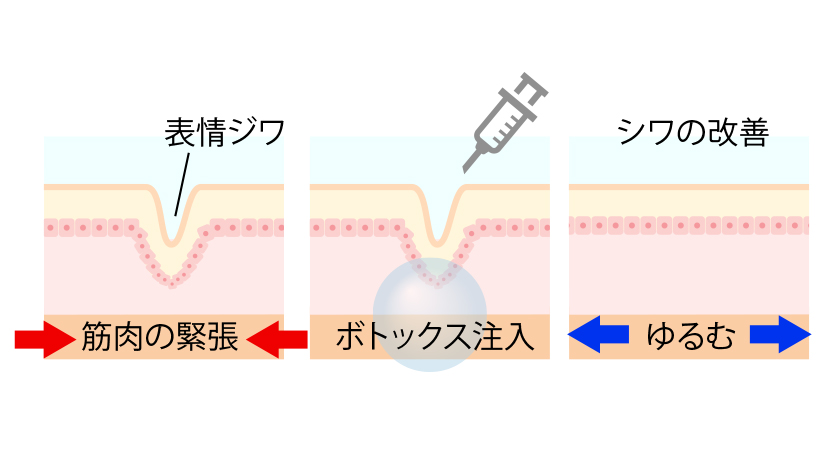 神経の働きを弱め、筋肉をリラックスさせる効果があります。ボトックスを使用することにより、ボトックスは、表情によってできるシワを目立たなくする効果や、汗を抑える効果が期待できます。