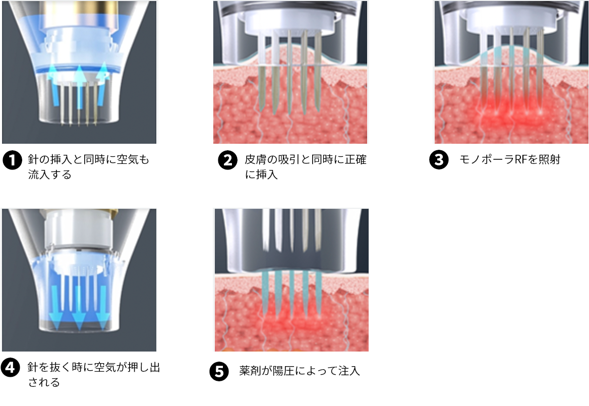 マイクロニードルで開けた穴から様々な薬剤を導入することが可能です。このことを「ドラッグ(薬剤)デリバリー(運ぶ)」と言います。ポテンツァ独自のポンピングチップで安全かつ効果的に薬剤を皮膚の奥まで注入することで効果を最大限引き出すことができます。