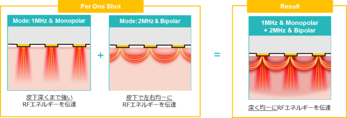 1ショットでモノポーラとバイポーラが照射される独自の照射方式となっています。