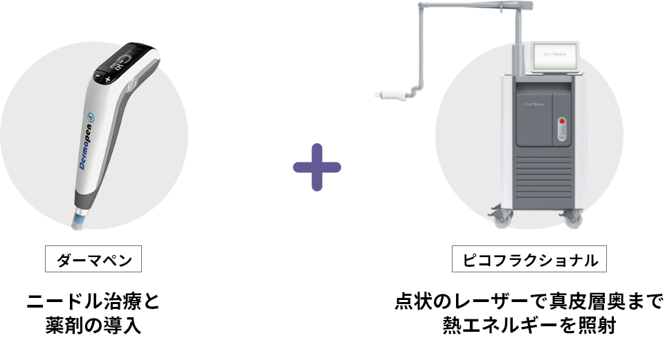 ダーマペンは、極細の針で皮下に刺入し、創傷治癒能力を活性化させる「ニードル治療」とニードルが刺入した穴へお悩みに応じた薬剤を導入できる「導入治療」が得意な施術です。一方、フラクショナルは、ドット状に皮下に穴をあけ、レーザーで真皮層奥まで熱エネルギーを届けることで、肌再生を可能にする治療です。この二つの治療の施術を同時に可能にしたのが、ポテンツァです。