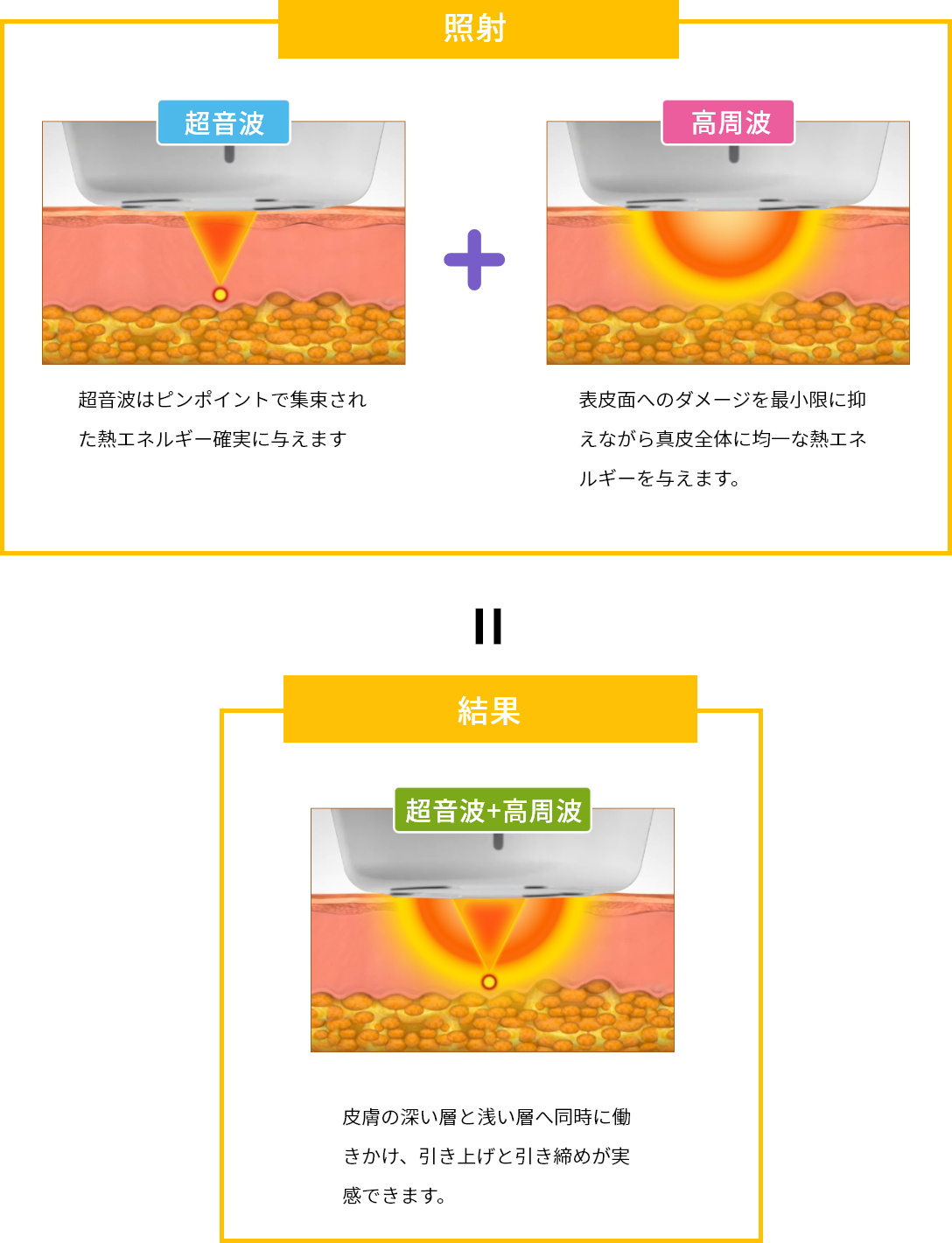 超音波と高周波を同時に照射することで引き締め効果が実感できます。お肌の浅い層から深い層までの広い範囲に高いエネルギーを均等に照射できるため、お悩みの症状をみて患者様にあった治療のご提案ができます。
